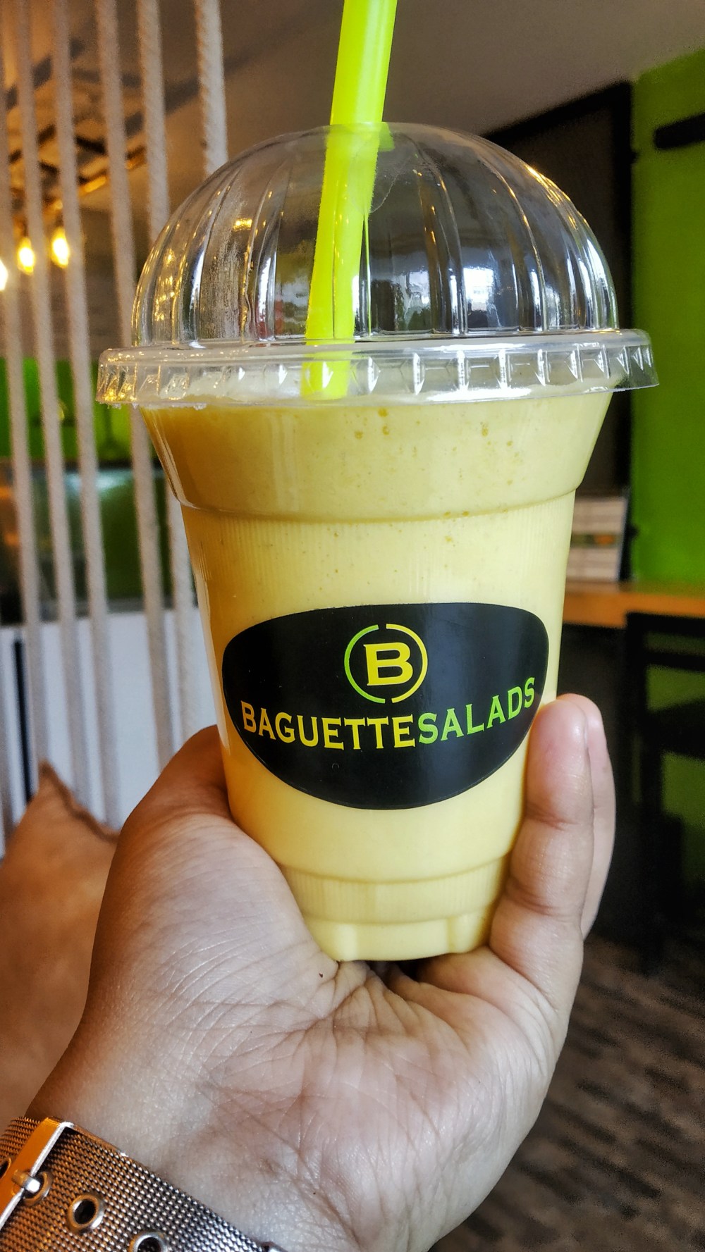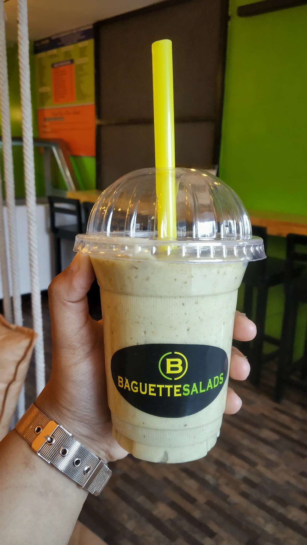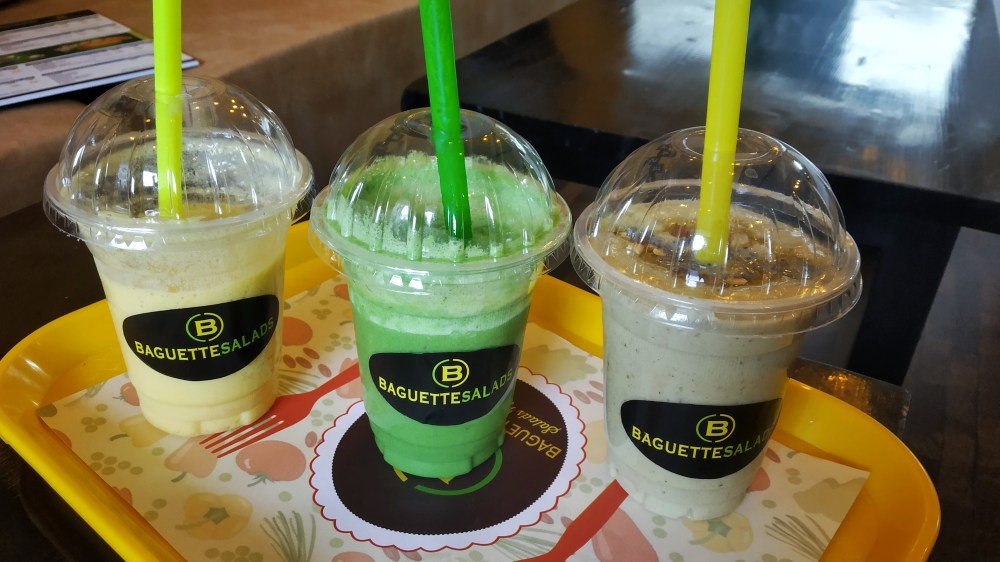Original Greens Smoothie: This smoothie is a blend of apples, pineapples, spinach leaves, kale leaves, chia seeds, and vanilla ice cream! This luscious smoothie is a must try in Baguette Salads!