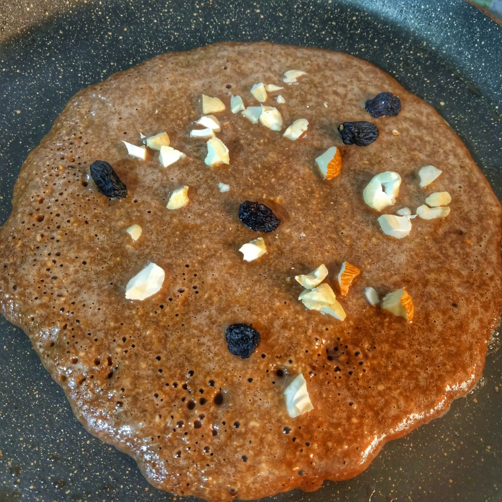 Flip the pancake when it is cooked at the bottom. You’ll know it is done when you see bubbles forming on the top.